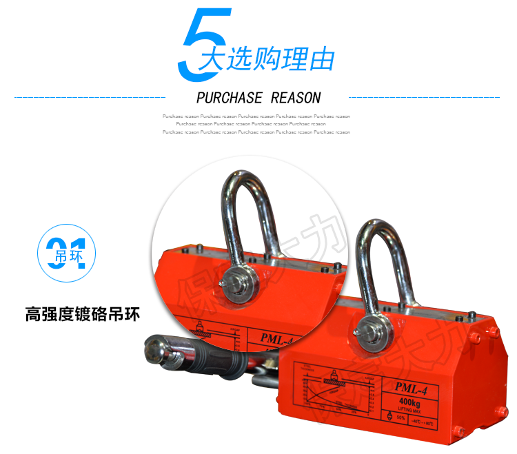 永磁起重器,全部采用N 4 O高牌號(hào)釹鐵繃為磁源,內(nèi)部磁路設(shè)計(jì)合理、結(jié)構(gòu)獨(dú)特、焊接材料特殊、密封性能好、外觀設(shè)計(jì)別致、定位正確。因此該產(chǎn)品與國(guó)內(nèi)同類(lèi)產(chǎn)品相比、具有體積小、吸力大、剩磁小軸頭不易斷裂、壽命長(zhǎng)等各種優(yōu)點(diǎn)。